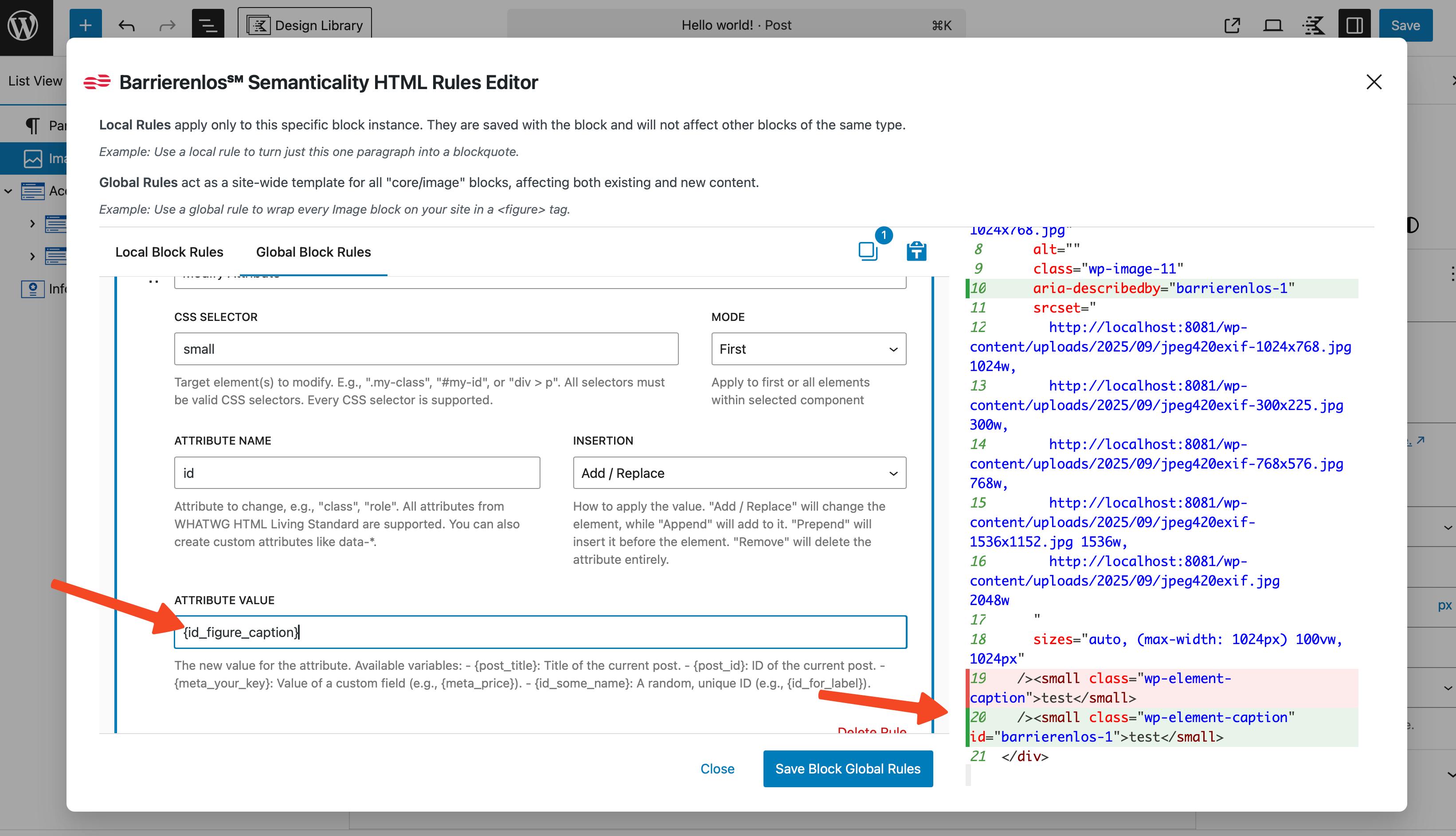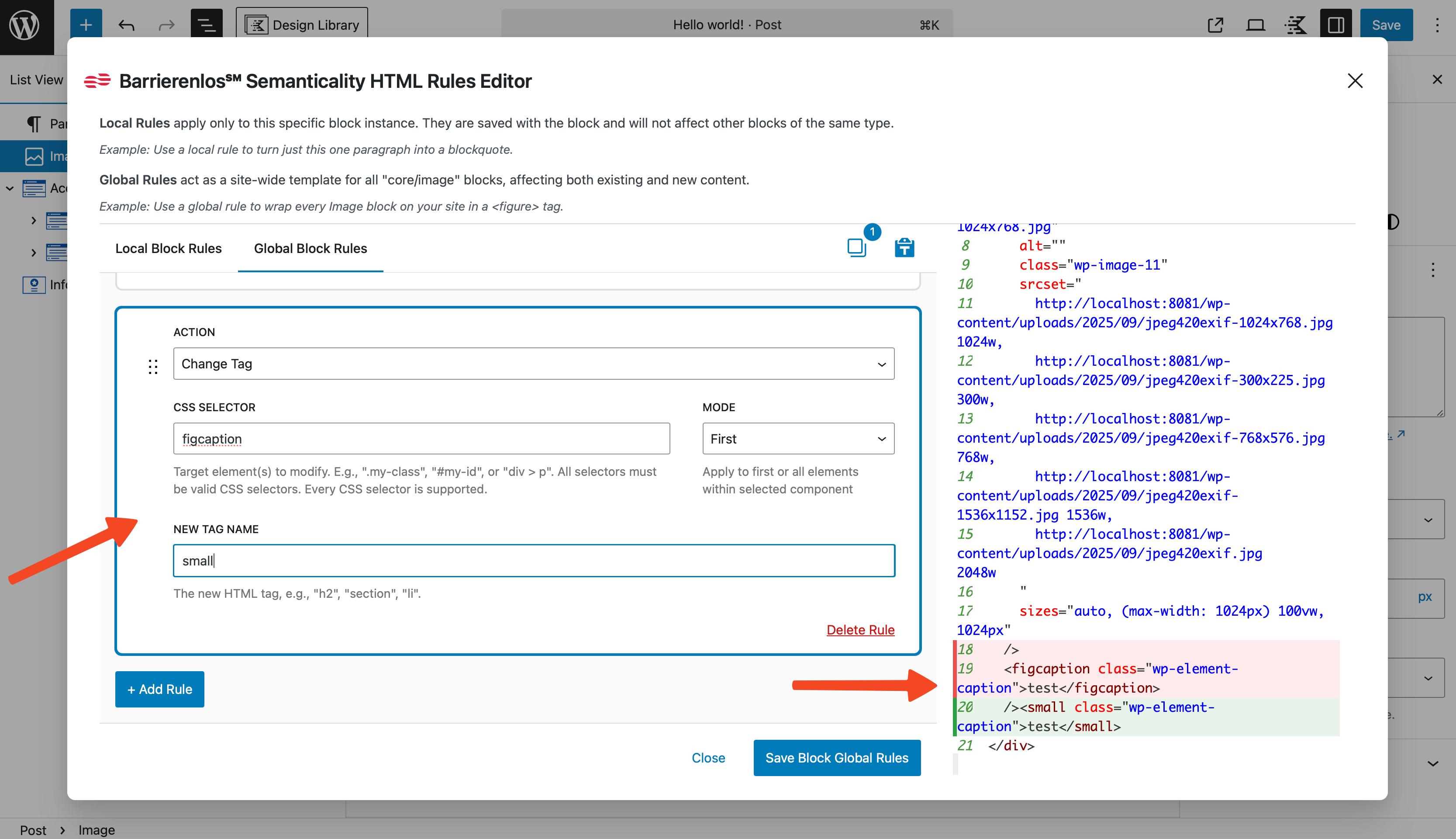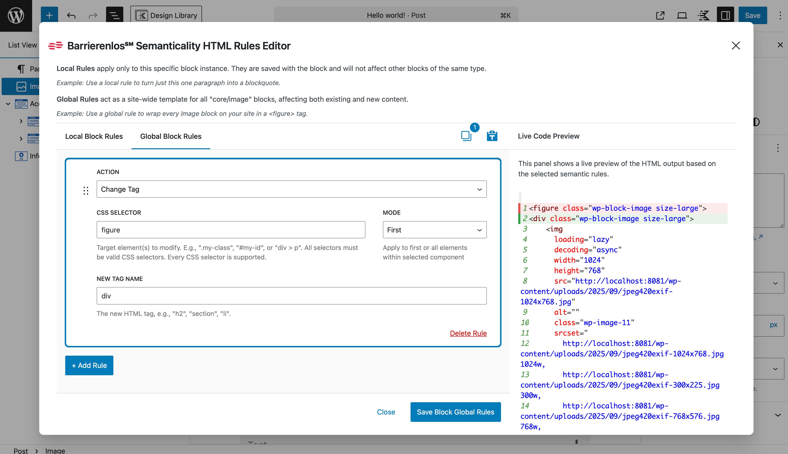 Semanticality™ acts as an intermediary layer between Gutenberg and the final HTML. Each time a block is rendered, the plugin "traverses" its structure and checks if there are rules for that block. If rules exist, the HTML is modified on the fly.