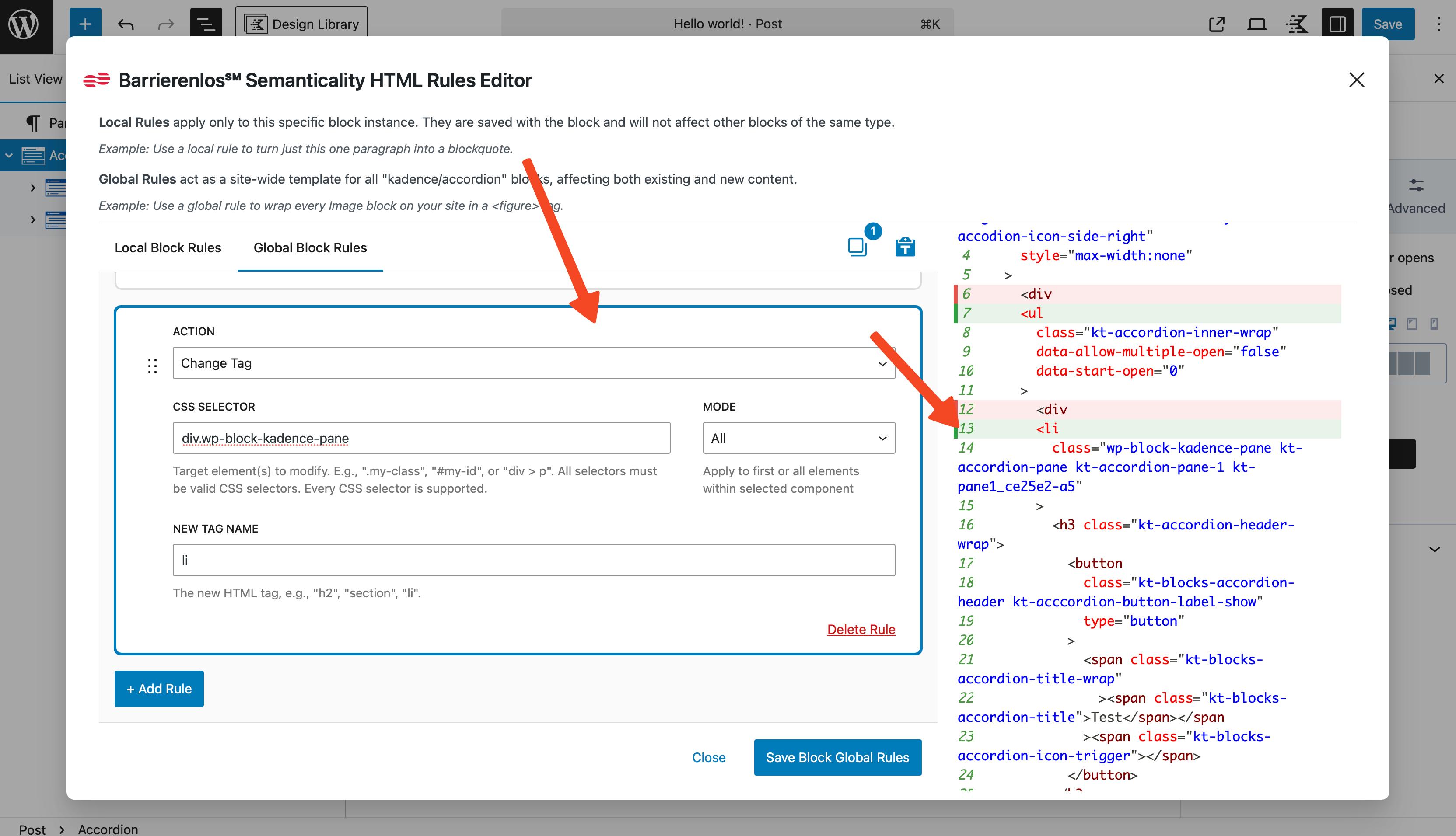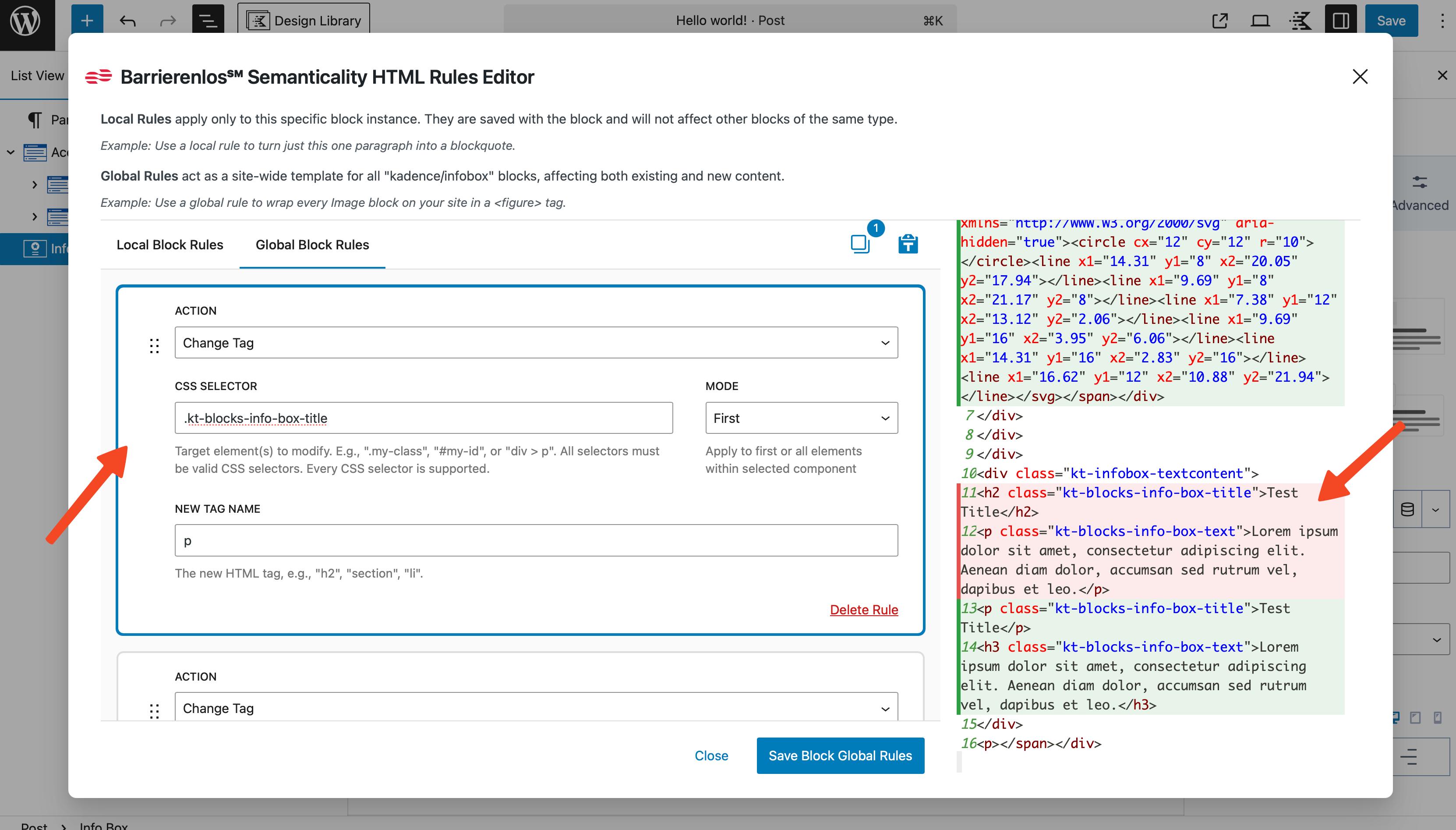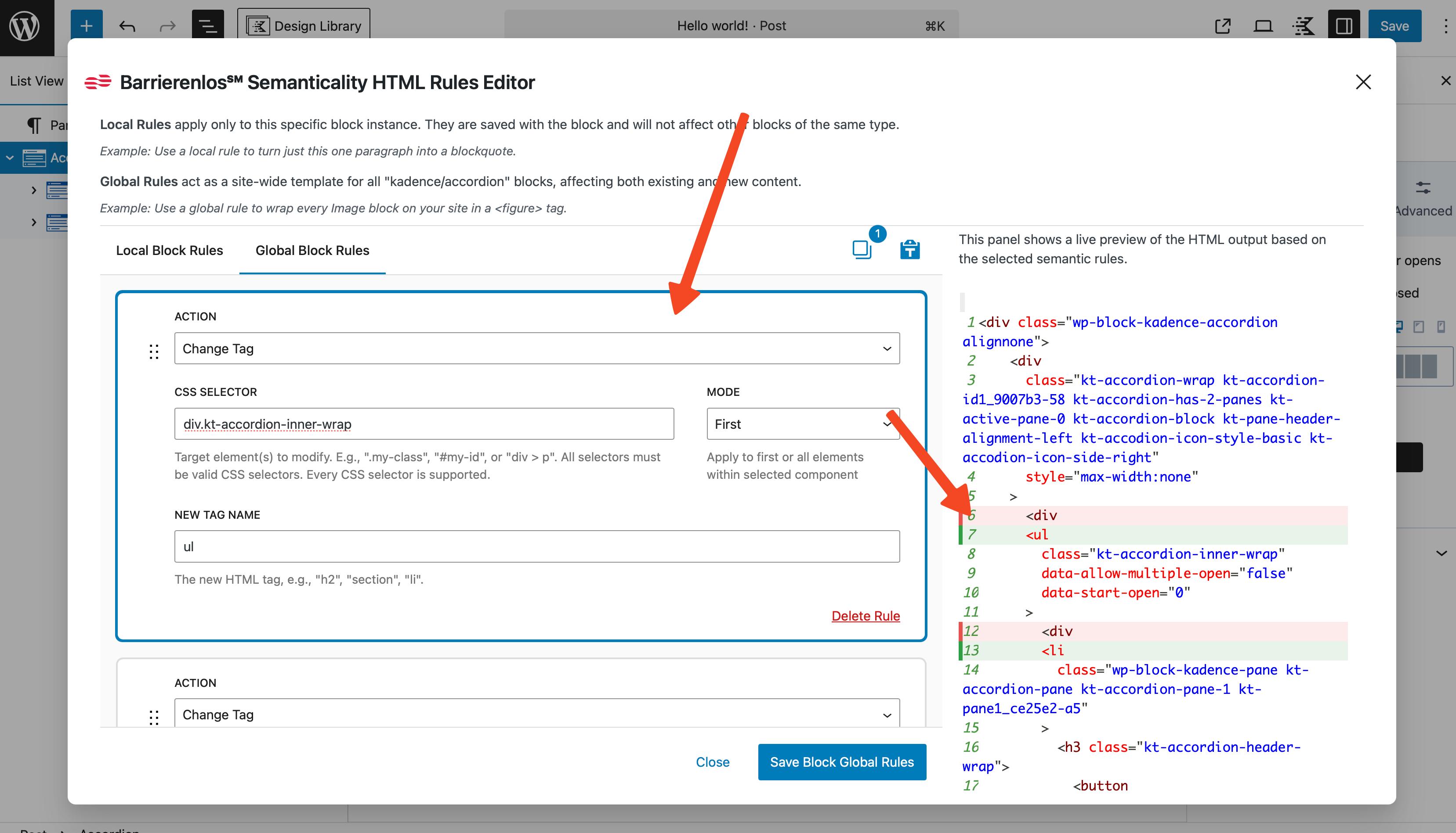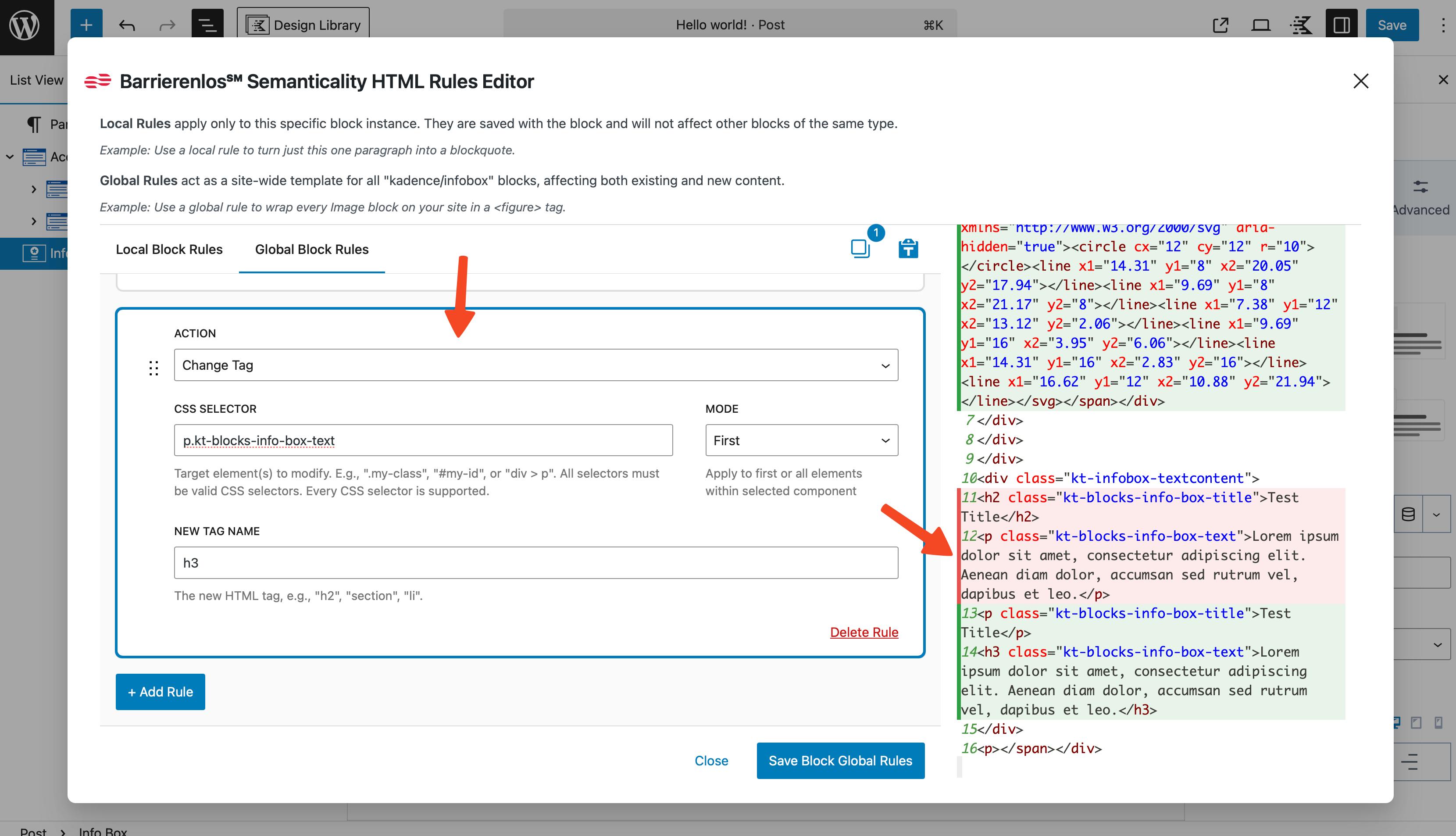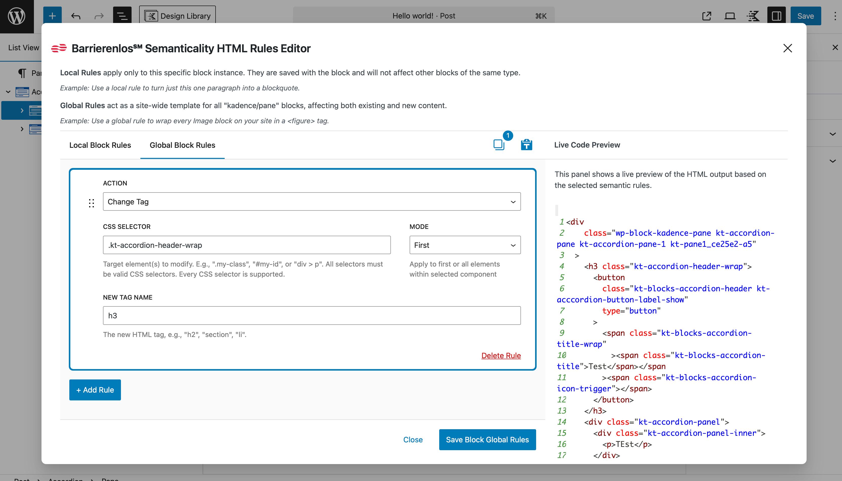 - The right-hand Live Code Preview panel, showing the difference in the block's HTML before and after applying the rules.