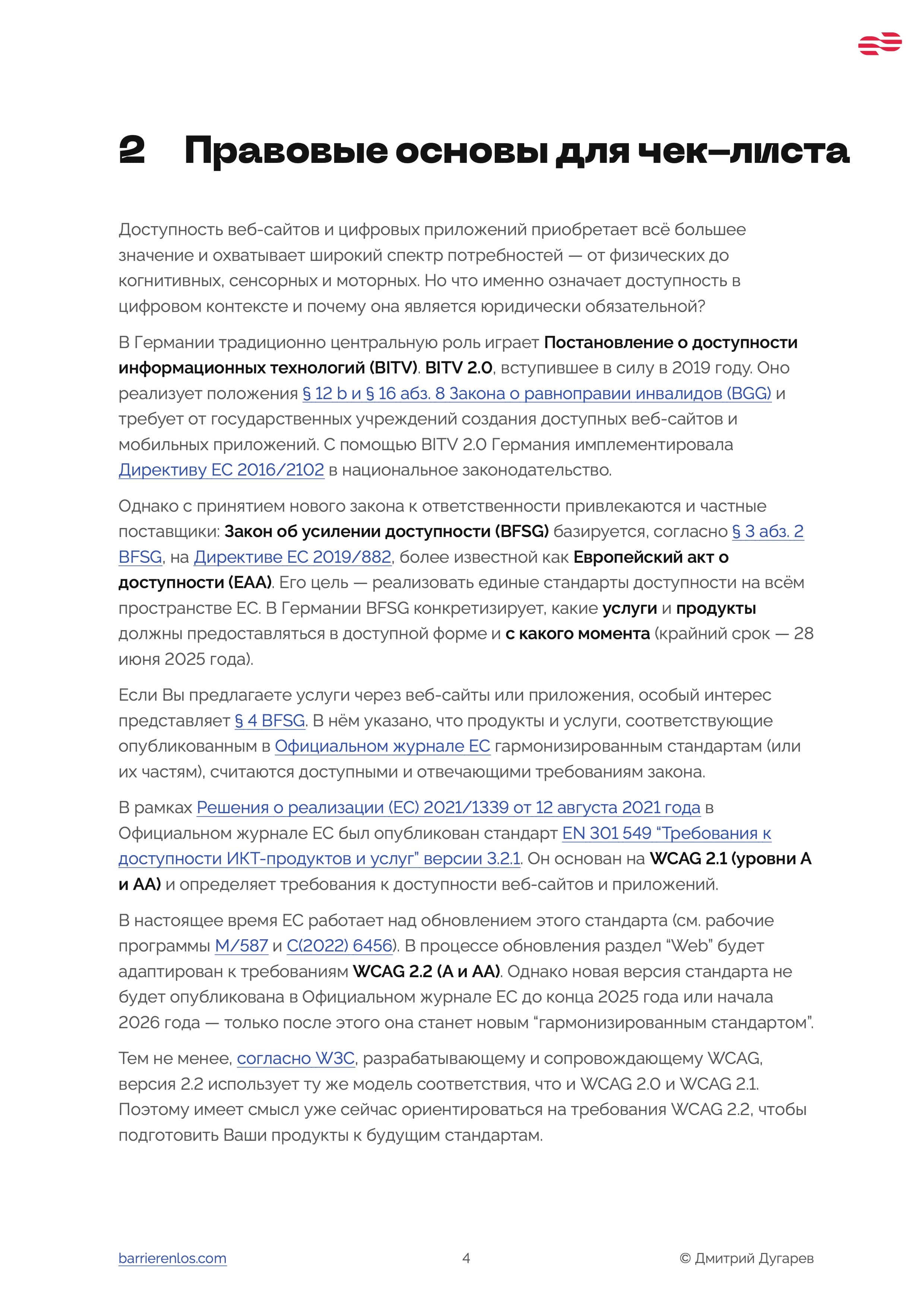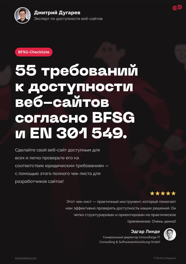 Начните с нашего бесплатного EAA-чек-листа, где вы найдете все 55 требований EAA и WCAG 2.2 (A и AA) и поймете правовую ситуацию в Германии.